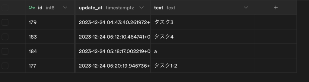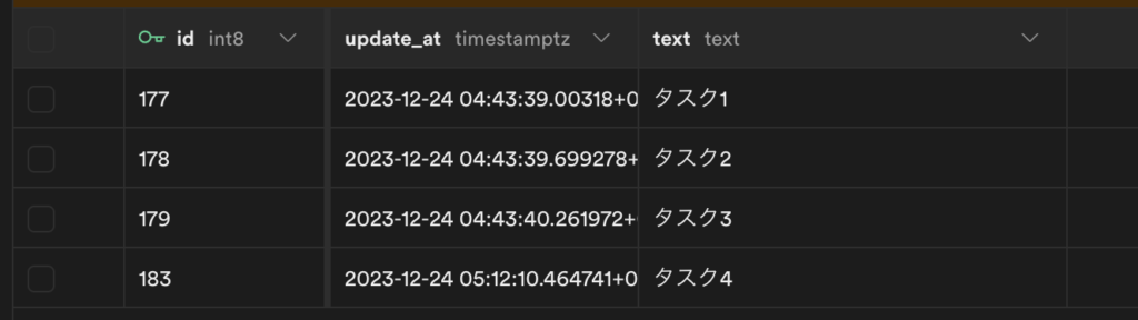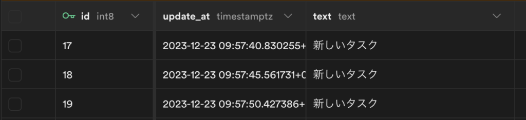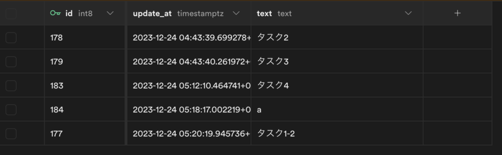を行い、Supabaseのテーブルを見ながらCRUDの全てがちゃんと行われているかどうか確認してみましょう!