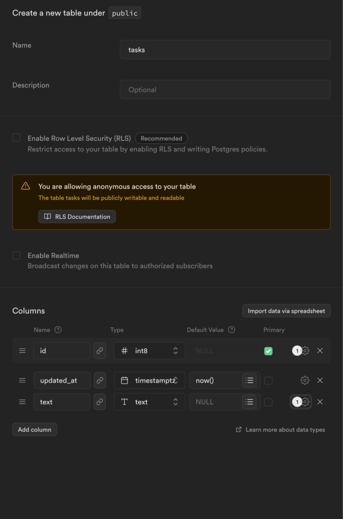 今回は認証機能を利用せず、シンプルにTodoアプリを作りたいため、RLSの有効化チェックをOFFにしています。