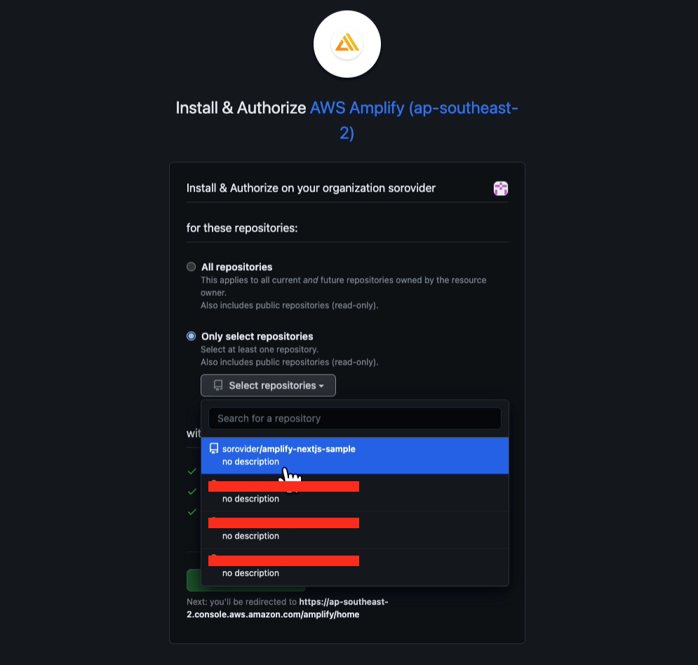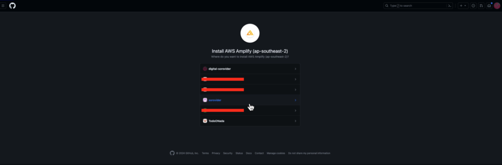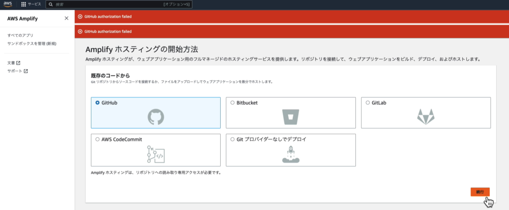 ※基本的にAWS Consoleの画面に自動でリダイレクトされるはずですが、自分の場合はGithub authorization failedと表示されました。