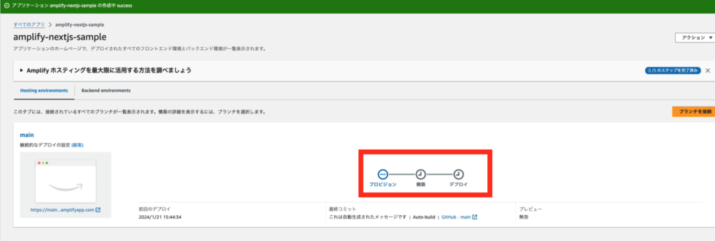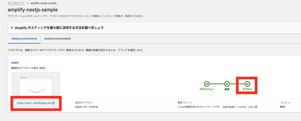 - デプロイに緑のチェックマークが表示されていれば、デプロイ完了です。