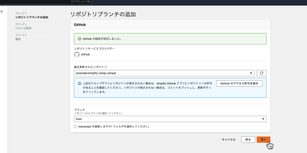 デプロイしたいリポジトリを選択し、`次へ`を押してください。