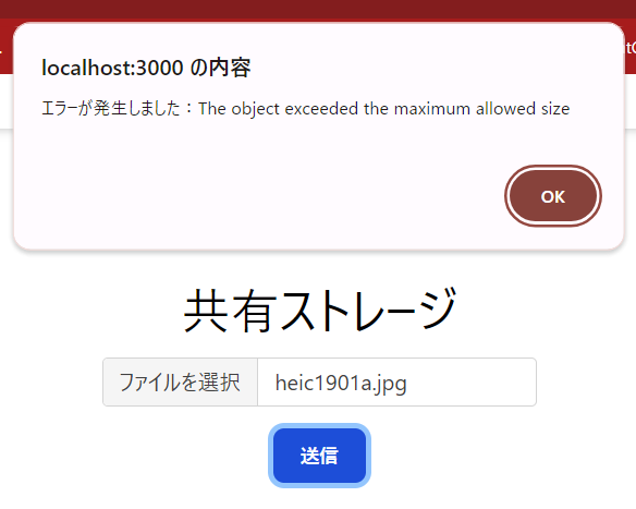 こちらの画像をアップロードしようとすると下記のようにサイズ制限に引っかかった旨のアラートが表示されます。
