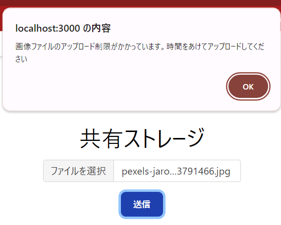 この状態でファイルをアプリからアップロードしようとすると、下記のように時間を空けてアップロードすることを促すアラートが出ます。