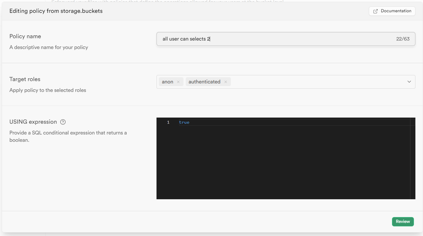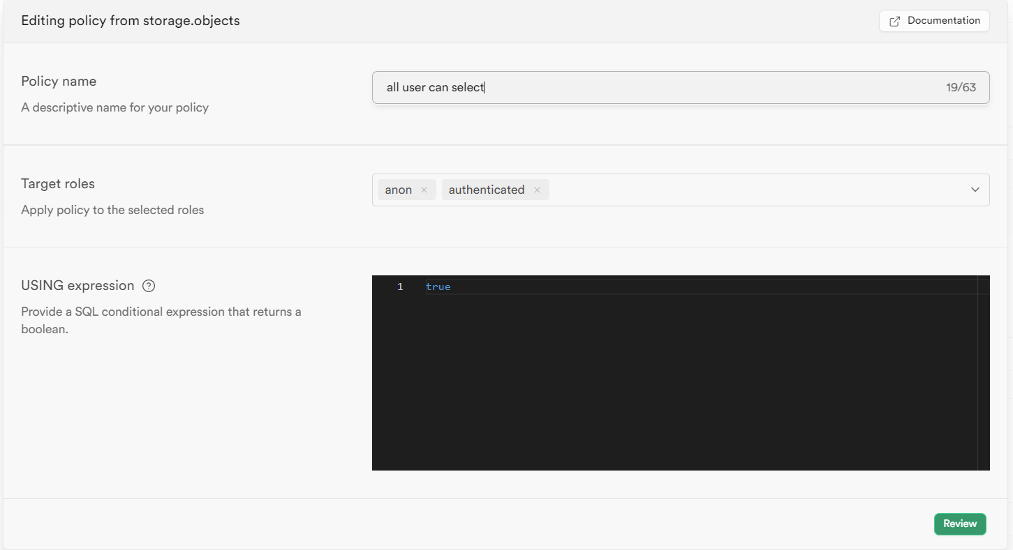 Supabaseのダッシュボード→`Storage`→`Policies`をクリックします。