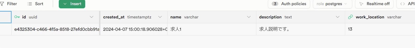 入力して保存を押すとSupabase側の`trn_job`に作成した求人情報が追加されます。