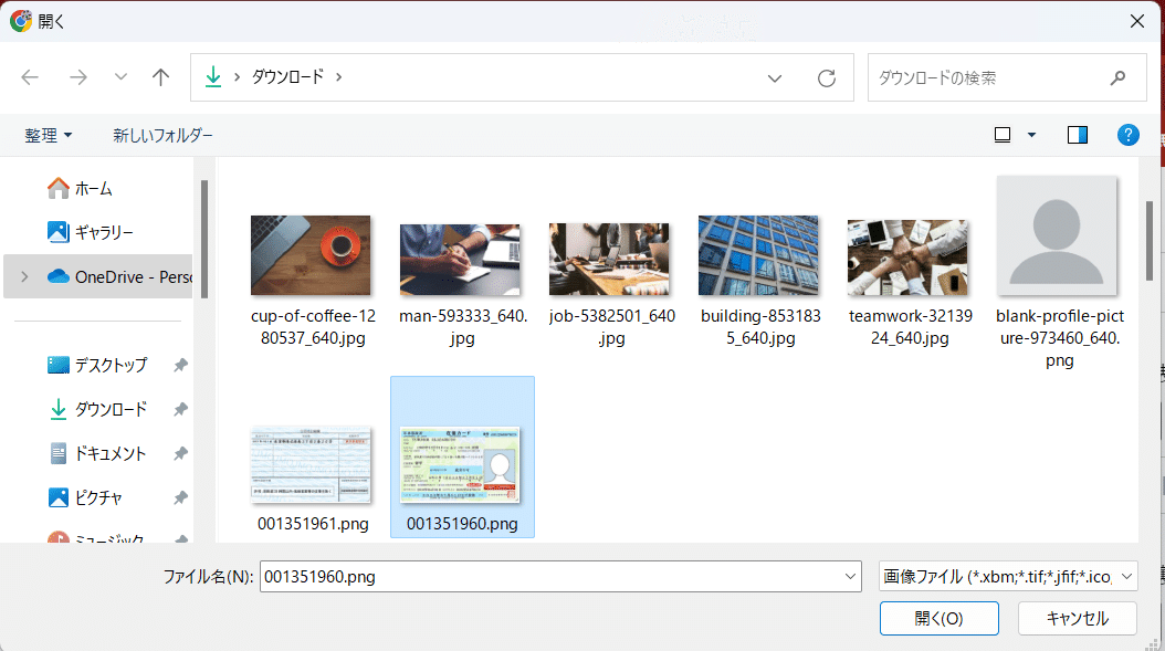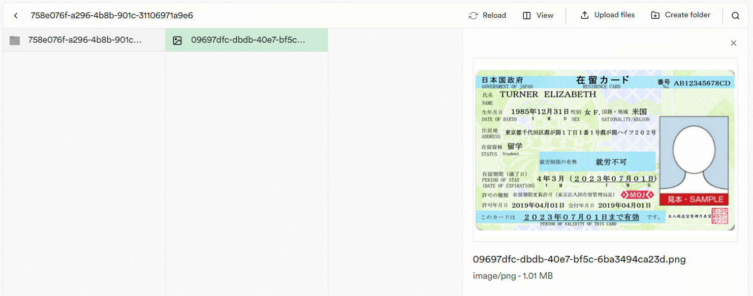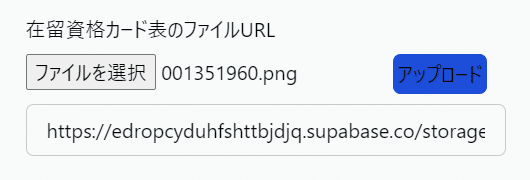在留資格カード表をクリックし、サンプルの画像を選択してアップロードすると、入力欄へURLが表示されます。
