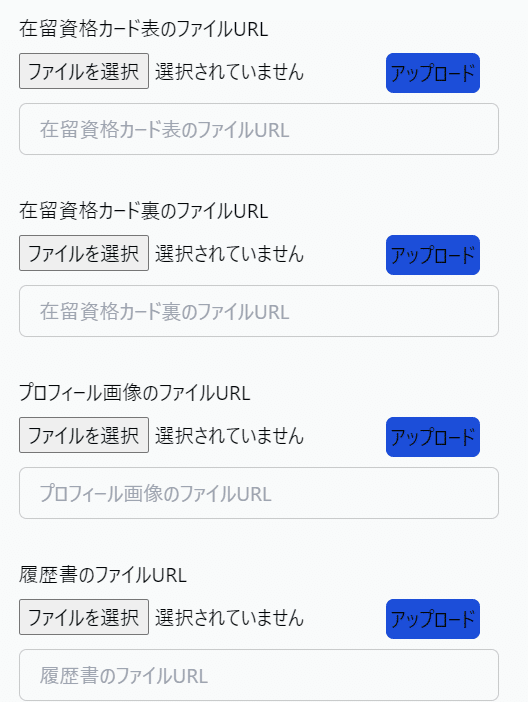 ユーザページに遷移して下のほうまでスクロールすると在留資格カード~履歴書までアップロードするためのUIが表示されるかと思います。