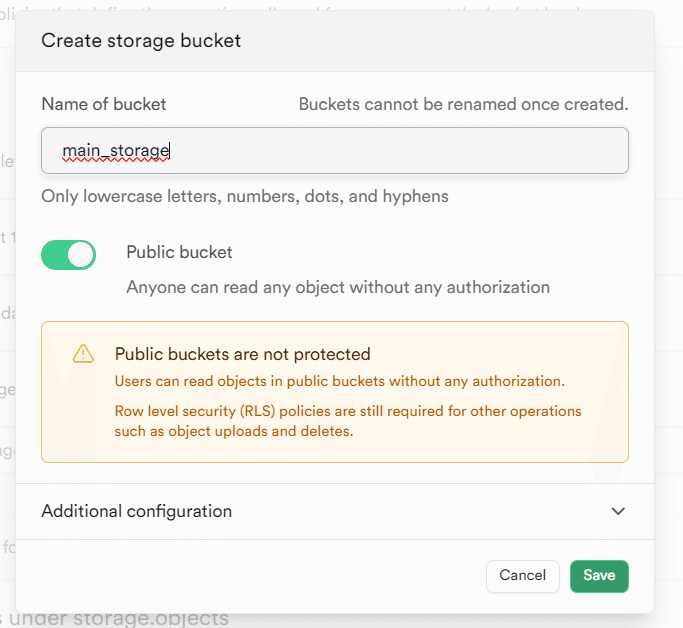 Supabaseのダッシュボード→`Storage`→`New bucket`から添付画像のような設定でStorageを作成します。