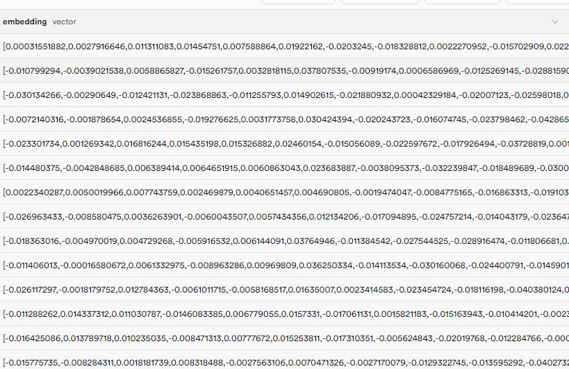 Supabaseのデータベースに実際に格納するベクトルデータは、このような形になります。