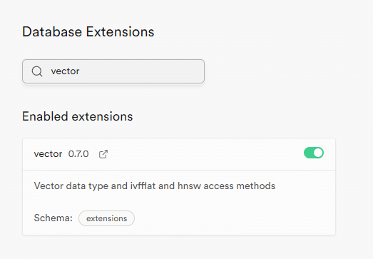 まずSupabaseのダッシュボードにあるDatabaseのExtensionsから、`vector`を検索し有効にします。