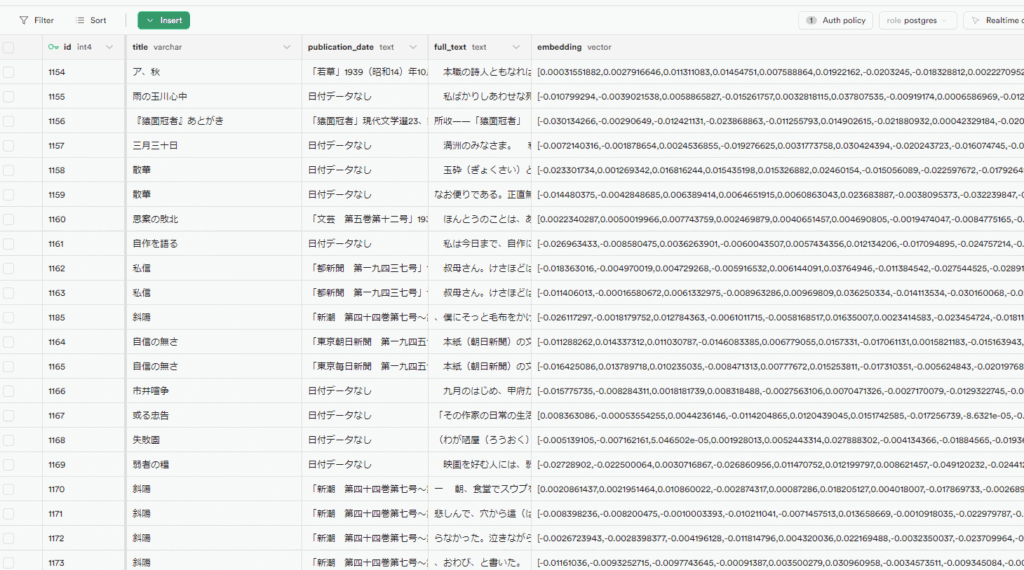 実行完了まで時間がかかりますが、終わるとSupabaseのnovelsテーブルの内容が添付画像のような形になります。