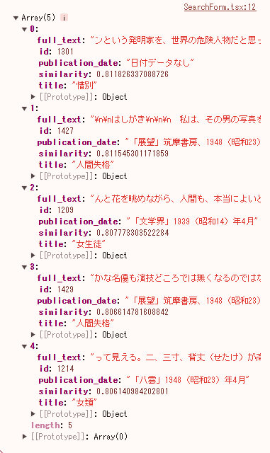 コンソールに検索した小説の情報が格納されているので、何に引っかかって検索されたのかがなんとなくわかるかと思います。