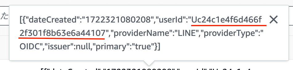 また、リクエストするユーザーIDは”U”から始まるuserIdです、Cogintoのidentitiesから確認することができます。