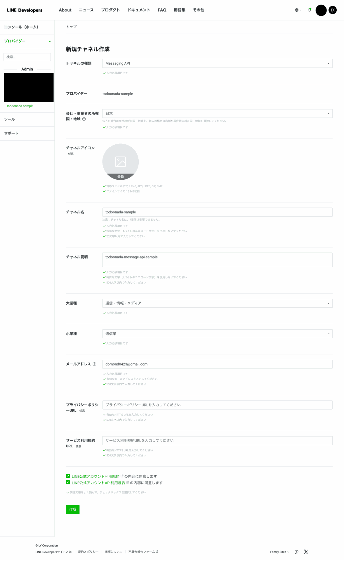更に規約が2つ程出てくるので『同意する』を押すと、MessagingAPIが作成できます。