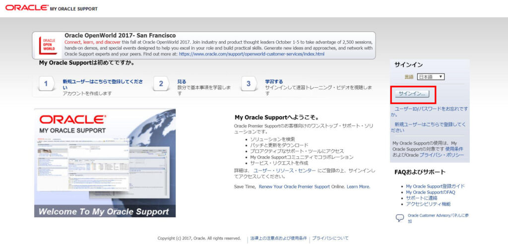 OracleDBのパッチには数種類ある。 最も一般的なパッチPSUのダウンロード方法を紹介します。 最新PSUのダウンロード まずは「My Oracle Support」へアクセス。 下の画面の赤枠を押してサインインしよう。 ユーザ名とパスワードを入力しサインイン。 「パッ...