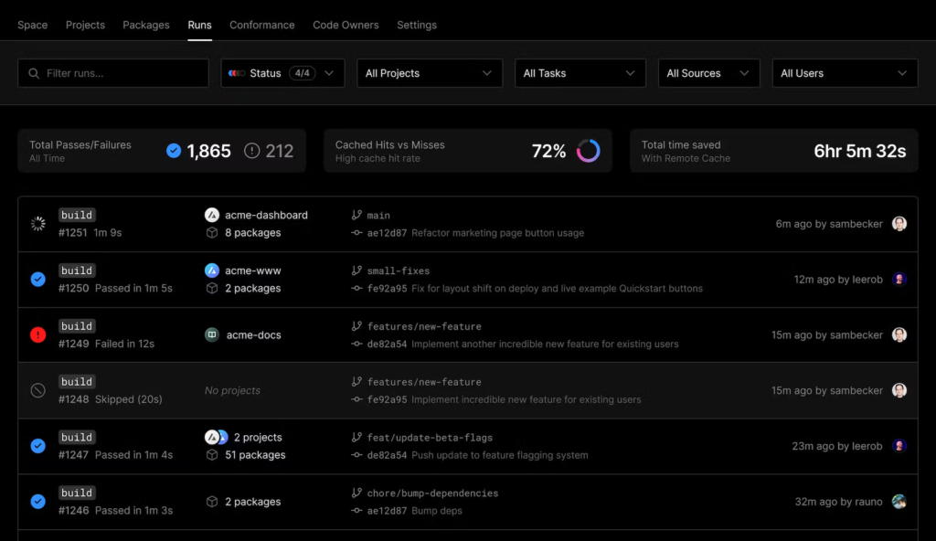 Runsは、各ビルド実行時にURLを生成します。開発者はこのリンクを共有することで、ビルドの問題を共有したり、解決策についてチームで議論することが可能になります。